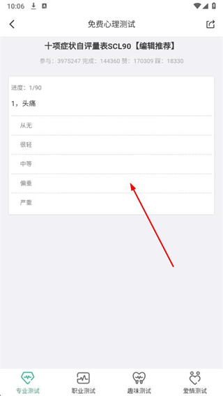 3、按照测试题目,从选项中选择符合自身情况的选项,依次完成所有题目,即可完成心理测试。