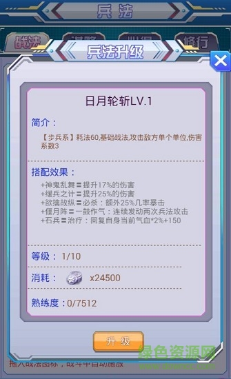 这四类兵法都是可以升级的。都是被动升级,只要装备了兵法参就可升级了!值得一说的是对于我们屌丝来说每天一次的快速战斗不只是能快速获得经验,也是给兵法升级的一个非常不错的办法哦!