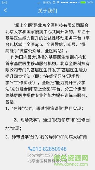 掌上全医”是国家慢病中心主导开发的、专注于基层医生慢病管理能力提升的服务平台。国家慢病中心是中国疾病预防控制中心的直属单位,是国家级慢性病与伤害预防控制专业机构,是全国慢性病和伤害预防控制业务技术指导中心。“掌上全医”坚持“全心全意服务基层医生”地服务理念,充分融合全医科技专家团队开发的“基层医生能力提升四步学法(即:“在线学习”+“现场教学”+“师带徒学”+“工作实践”),分步骤给基层医生提供专业的慢病管理能力提升服务。北京全医科技有限公司为 “掌上全医”平台提供技术支持。