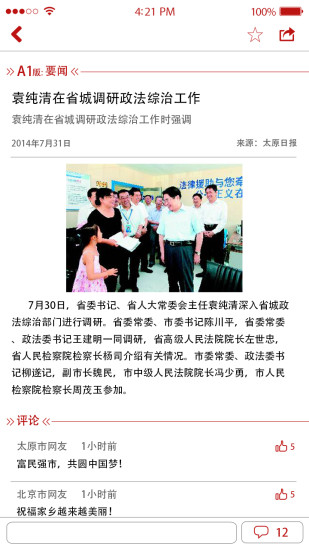 太原日报app是一款操作简单易用,集权威性、公信力、影响力为一体,融报纸在线浏览、新闻阅读、资讯推送、网民报料、活动参与、微互动等诸多功能的太原主流新闻信息平台。赶快下载看看吧!!!
