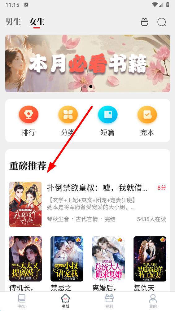 2、在书城页面选择一本想要阅读的小说,点击进入书籍详情页。