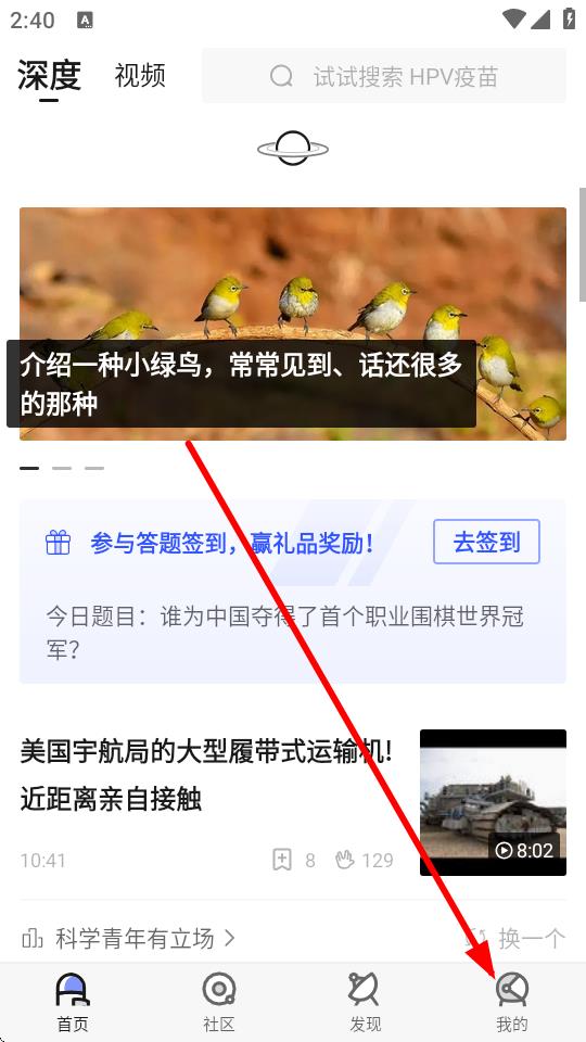 1、打开果壳网app进入首页,点击底部导航栏中我的选项进入个人页面。