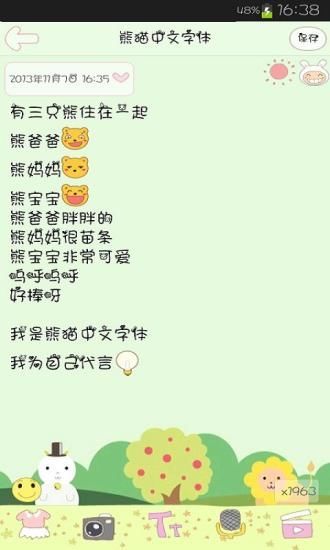 熊猫中文字体是一款以可爱为主题的艺术字体软件,(它只适配包括Galaxy S4在内的三星手机),它不需要ROOT也不需要重启,可以轻易改变系统字体,简单的改变您的心情!个性化手机由您主宰!让您每天都有一个快乐的心情,新鲜的体验,这么萌的字体,小伙伴们都惊呆啦!