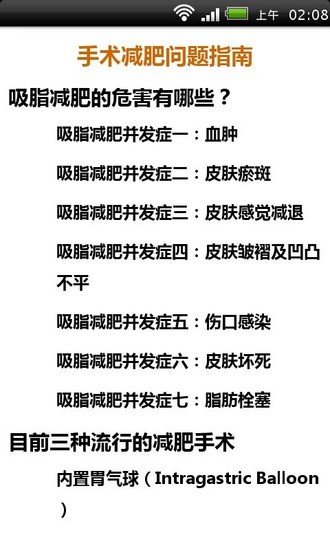 手术减肥问题指南是一款为手术减肥人士提供的非常全面的应用,手术减肥指利用医学外科手段,改善肥胖症患者的全身症状例如:体重超标、高血压、血脂高、糖尿病等症状的医疗方法,目前世界主要流行的四种医疗减肥方法为:例如:缩胃术、胃旁路、胃束带、胃内水球疗法等。通过手术减肥问题指南可以更好的帮助你了解手术减肥的利弊。