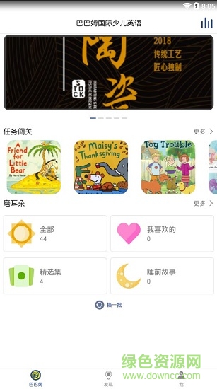 精致的磨耳朵,有多种频道与分类,在学习英语之余,能在磨耳朵中放松耳朵,磨耳朵播放器支持各种循环模式,以及音乐闹钟模式,方便孩子在磨耳朵中听着故事入睡。