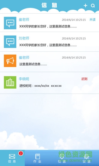 2.信息:老师通过信息功能,可以发布家庭作业、通知、留言和查看学生考勤;