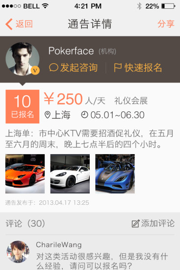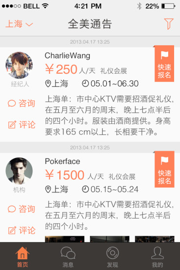 云美通告是一款为艺人,经纪人/经纪机构发布,报名工作的手机应用软件。软件完全免费,包括通告首页,发现,消息,我的四大模块,提供最新最好的通告给艺人,模特和学生,意在为艺人提供个人展示,工作推送,在线报名等个性化服务;为经纪人/经纪机构提供以通告为核心的适配度高的模特艺人。