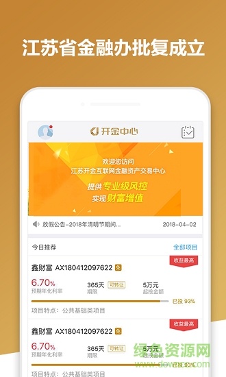 开金中心手机版是一款值得信赖的p2p理财平台,依靠强大的风控体系为用户带来安全可靠的理财产品,每日热门推荐不断更新,在线交易资金由第三方担保,个人交易明细及收益情况详细显示,欢迎来绿色资源网下载!