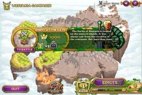 在十五世纪后期,整个欧洲大陆都战乱纷纷,这块土地上大大小小遍布着城邦与帝国,他们虽然规模不一,但却有着同一个野心与目的。各个帝国都想统一欧洲大陆,甚至想称霸世界,狼烟四起,战火纷飞,是十五世纪这块大陆的真实写照。即使再大的国度也有被毁灭的危险,同时再小的城池也有获胜的机会,要想不被别的帝国消灭,只能通过不断的入侵小国,增强自己的实力,当自己强大的时候就可挥兵攻占强国,从而达到统一世界的目的。合理地出兵,成功地占领所有敌人的城堡(要进入毁坏的敌人的城堡里)即可进入下一关哦!