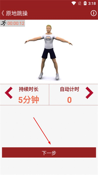 3、查看持续时长、自动计时等信息,点击下一步即可跟随指导进行健身锻炼。