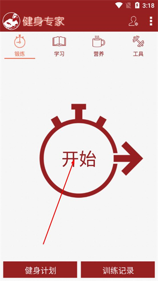 1、打开健身专家APP,在锻炼板块点击开始,进入运动准备阶段。