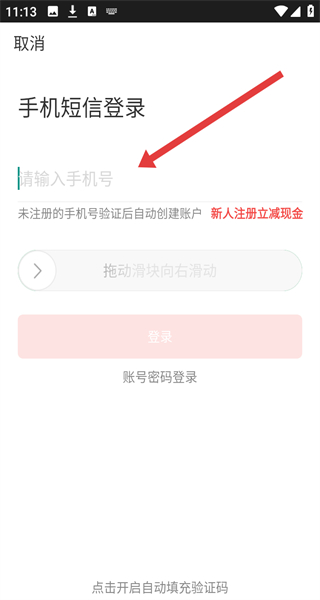 3、在跳转至手机短信登录页面时,可以点击输入框填写手机号,拖动滑块获取验证码。
