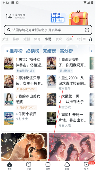 1、打开uc浏览器极速版,在底部导航栏点击中间的菜单。