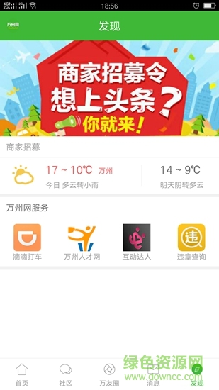 万州网app是针对重庆万州市民打造的一款本地生活服务软件,吃喝玩乐全面覆盖,提供找工作、找房子、二手买卖、寻人寻物启事等,超多论坛一站式满足用户需求,欢迎来绿色资源网下载!