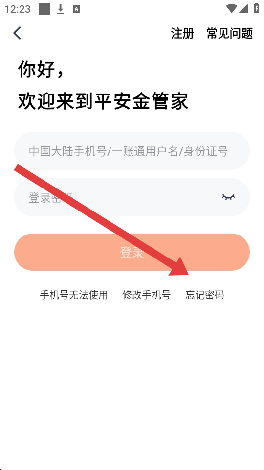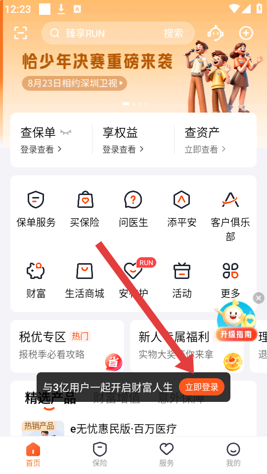 1、打开平安金管家APP的首页,点击页面中间悬浮提示框内的立即登录按钮,进入账号登录界面。
