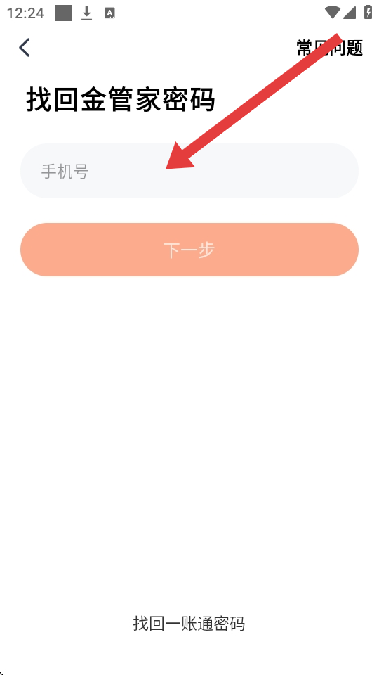 3、在找回金管家密码页面,于手机号输入框填写注册账号的手机号,点击下一步,后续按系统指引完成新密码设置。
