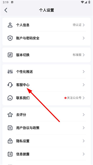 3、在个人设置页面,点击客服中心选项,进入客服中心页面。