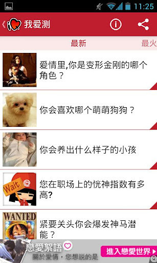 罗莉控大爱的超萌小M为您导航,配合直觉自然的使用界面,畅快浏览[我爱测]丰富精彩的心理测试内容!