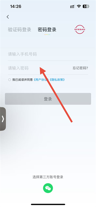 4、在号码栏填写账号,在密码输入框内输入密码,勾选协议后点击登录完成操作。