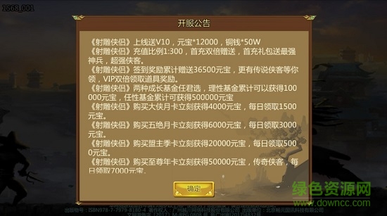 ——上线赠送VIP10、元宝*12000、银币*50W;