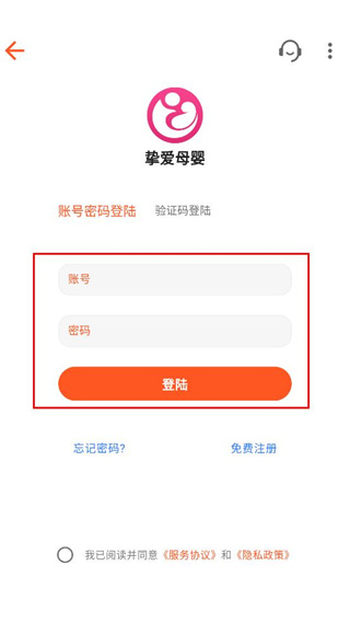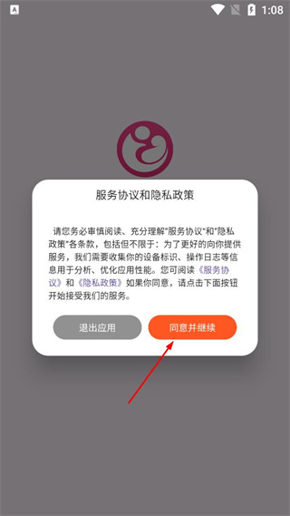 1、打开挚爱母婴服务APP,查看弹出的服务协议和隐私政策提示,点击同意并继续按钮进入应用。