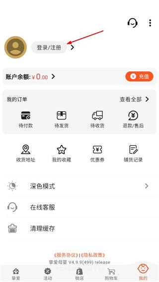 3、在个人中心页面找到登录/注册区域,点击该区域进入账号登录的信息填写页面。