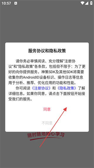 1、打开美森网校APP,在弹出的服务协议和隐私政策界面,点击同意。