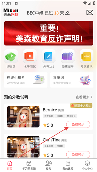 2、在预约外教试听板块,选择想要预约的外教,点击外教卡片右下方的免费预约按钮。