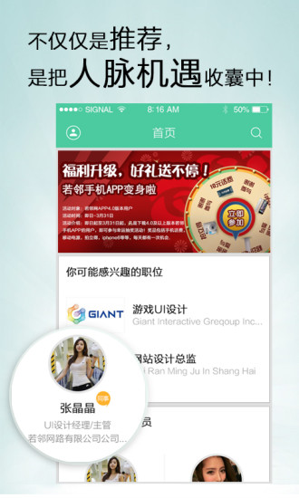 若邻社交招聘这是一款有关招聘信息的软件。找工作、招人才、托猎头?看公司、聊职场、谈人生、总有一款属于你的工作!