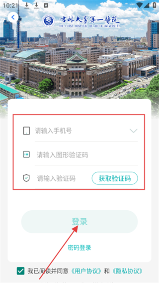 3、输入手机号、验证码,输入图形验证码和,勾选同意用户协议和隐私协议,点击登录。