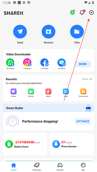 1、打开茄子快传主界面,点击右上角的加号按钮,展开功能选项列表。
