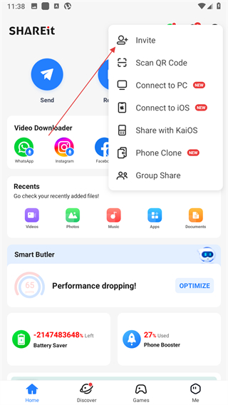 2、在展开的功能选项中找到Invite选项并点击,进入邀请好友的操作页面。