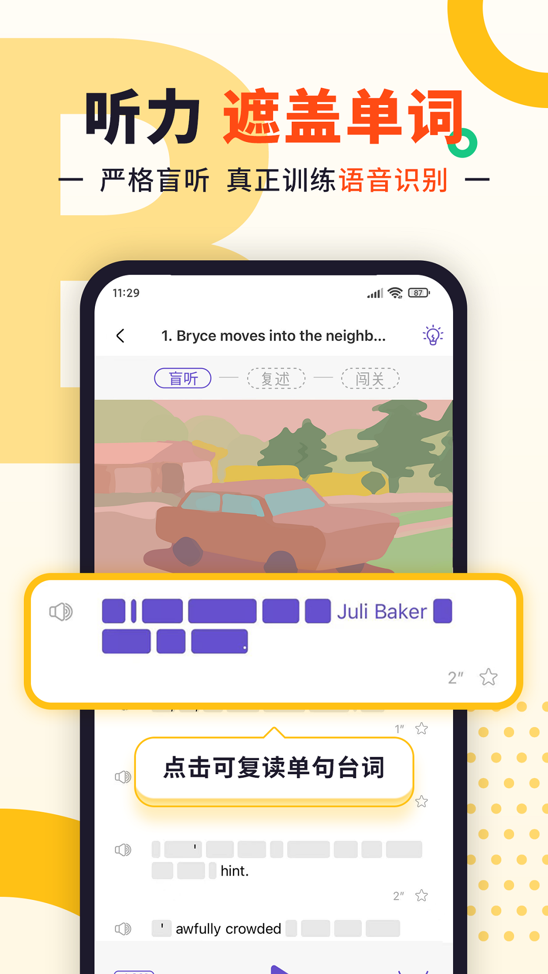 盲听 - 分级隐藏字幕单词,屏蔽文字依赖,训练语音识别;