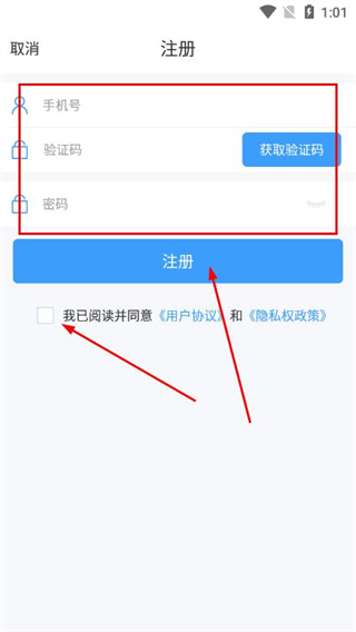 2、输入手机号,点击获取验证码并填入,设置登录密码,勾选协议,点击注册。