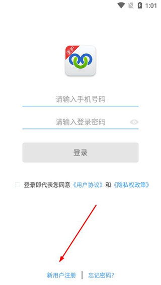 1、打开蓝牛医护APP,在登录页面点击新用户注册。