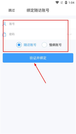 3、选择绑定随访账号或慢病账号,输入账号和密码后点击验证并绑定,完成注册。