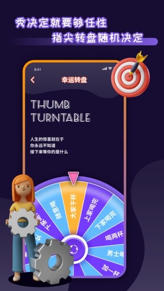 聚会无聊?吃饭抢着买单?不知道今天穿啥(吃啥)?纠结放假去哪玩?......让你在轻松愉快中,做出小决定,解决选择困难症!除此之外,在聚会派对,喝酒轮盘,活动等场景,也能发挥作用,例如天选炸弹和幸运转盘、拇指转盘等。