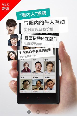 4、【圈内人】:垂直行业圈内人专区,能让有直接人才需求的企业中高层主管免费直接发布用人需求,同时展现自我价值;而圈中人才也可以与圈内的牛人互动,直面招聘所在部门,让面试更简单。还可以时时将心中偶像的资讯时时收藏及分享;