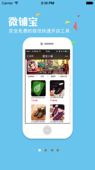 微铺宝是一款以微商城+微粉丝的手机开店软件,支持包括支付宝、银行卡、微信支付、货到付款在内的多种支付方式,支持手机开店、提供微信公众号、免费微信开店服务的微电商平台。在快速发展的互联网时代,微信商城购物平台在完整的购物体系上,拥有强大的技术实力,保证店铺访问的速度和稳定性。从信息推送到完整交易,一键导入操作式,省力方便快捷,大大增加了分销的成本,可以说是电商技术最前端的微信商城。