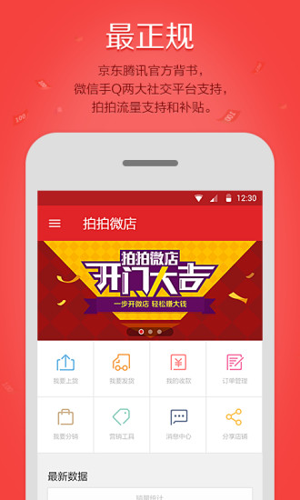 拍拍微店是一个简单易用的手机管理店铺的app,京东官方支持,无需担心信誉问题!开通拍拍微店后,可以用手机给产品拍照和编辑商品详情,一键上货。功能方面,拍拍微店支持大部分PC端店铺管理功能,包括商品管理、订单管理、数据统计等,用户在APP上能够实时查询店铺的销售数据和流量统计,甚至可对店铺进行简单装修。欢迎下载体验