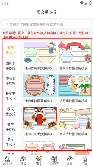 4、登录后点击“图文”按钮,进入图文手抄报界面,可选择通用、国庆节等各类手抄报模板使用。