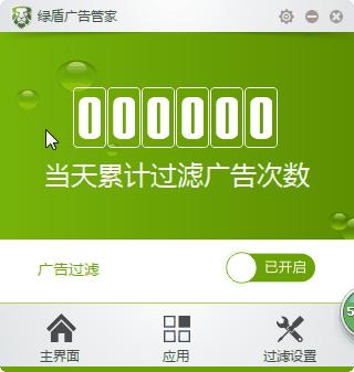下载安装后,在开始菜单栏、任务栏中找到绿盾广告管家的软件图标,点击后打开软件,将软件过滤的开关【开启】后,就可以全方位智能广告拦截
