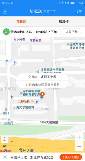 3、加急件订单进度页面可联系快送员及查看快送员位置;