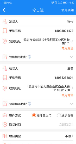 6、今日达下单界面新增智能地址填写、寄件方式及站点选择功能;