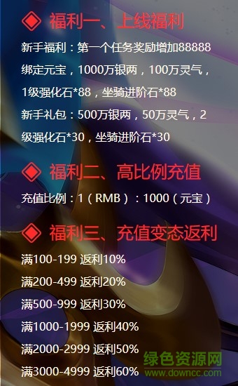 第一个任务奖励增加88888绑定元宝,1000万银两,100万灵气,1级强化石*88,坐骑进阶石*88 新手礼包:500万银两,50万灵气,2级强化石*30,坐骑进阶石*30