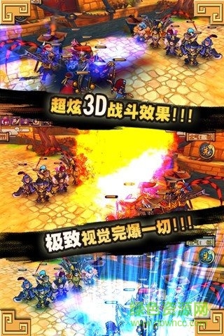 游戏纯3D打造,精致Q版本画风,华丽的战斗场景以及酷炫武将技能。