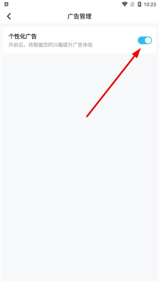 4、在广告管理页面,找到个性化广告对应的开关按钮,点击开关即可关闭个性化广告展示。
