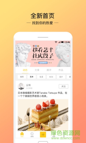 全新的视觉界面,通过热门、分类帮你发现更多元化的艺术内容和兴趣相投的小伙伴。