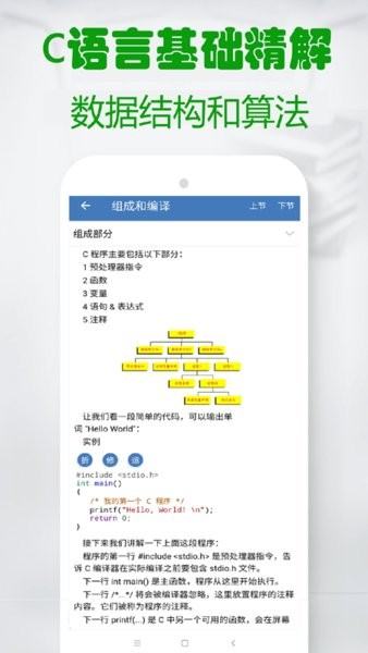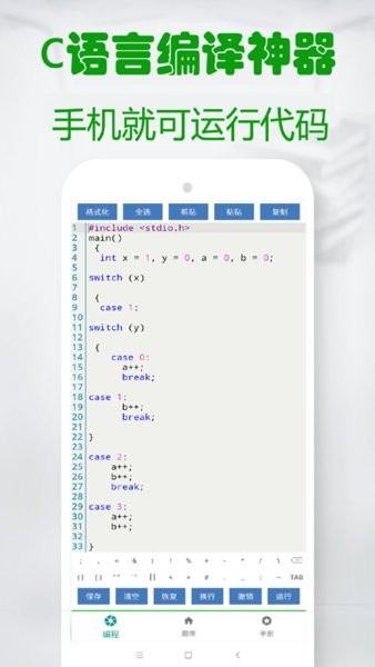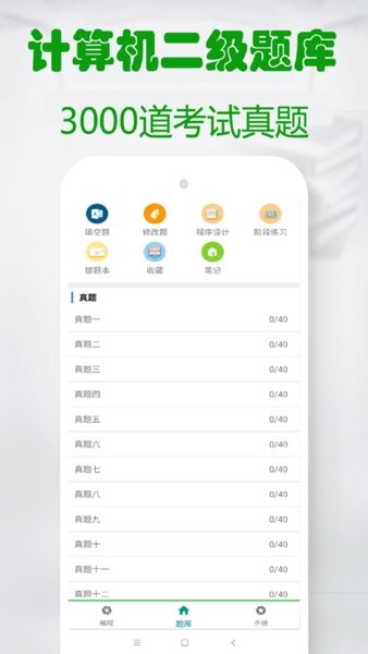 计算机二级和c语言编译器是本软件主打内容,让您一起学学习通c语言学习各阶段知识。软件首页就是c语言编译器计,第二页就是计算机二级c语言题库,堪称计算机二级宝典。