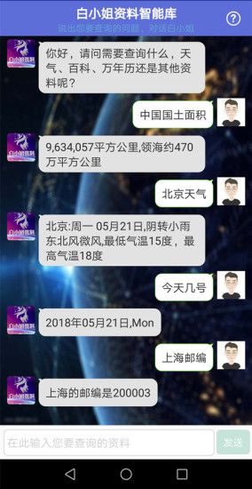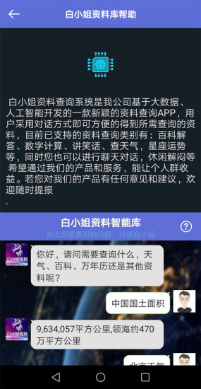 白小姐资料app是一款汇集了多项功能的查询类手游app。从百科知识、数学计算到天气查询,包含生活中的各类知识的解答,以文字聊天和语音汇报等形式让你能轻松快捷的了解到你需要的答案,一起来试试吧。